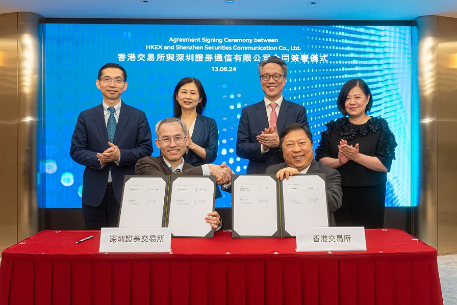 6月13日,深圳证券交易所(以下简称深交所)下属深圳证券通信有限公司(以下简称深证通)与香港交易及结算所有限公司(以下简称港交所)在香港举办技术合作签约仪式,共同参与香港综合基金平台建设。双方确定以深证通在香港建立金融数据交换平台,作为香港综合基金平台通信网络枢纽的基础,为在港金融机构提供合规高效、安全可靠、标准统一的基金市场基础设施服务。